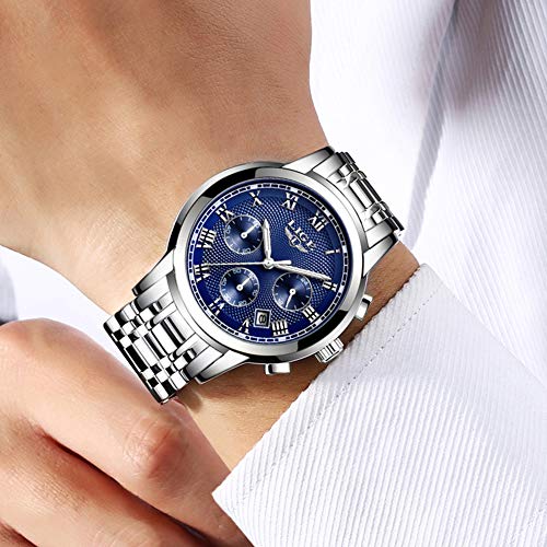 LIGE Mens Watches Elegant Silver Stainless Steel Chronograph Analog Quartz Watch Male Luxury Fashion Sports Waterproof Gents Business Dress Wristwatch Black Round Dial, Silver Blue Item Sku: