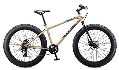 Mongoose Malus Mens and Womens Fat Tire Mountain Bike, 26-Inch Bicycle Wheels, 4-Inch Wide Knobby Tires, Steel Frame, 7 Speed Drivetrain Bicycle, Shimano Rear Derailleur, Disc Brakes, Tan, 18-Inch Frame