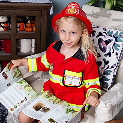 Little Wombats Firefighter Costume for Kids, (10 pcs) with Jacket, Helmet, Plastic Axe, Extinguisher, Megaphone, Ages 3 to 7 - Fire Chief Outfit with Fireman Toys - Halloween Costumes for Boys, Girls, Red, 3-6 years