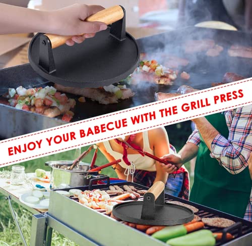 KITment Cast Iron Bacon Press with Silicone Pad, Smash Burger Grill Press with Wooden Handle, Hamburger Press for Griddle, Meat, Bacon, Steak, Food-Grade, 7inch Round
